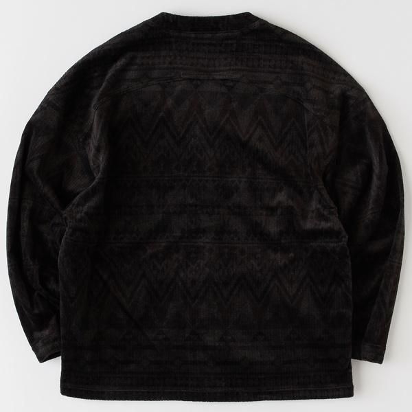 絶妙なダークトーンのネイティブプリントを施したスナップカーディガン。肌触りの良いコーデュロイ素材による着心地の良さはもちろんのこと、肩幅やアームまわりなどを大振りにすることで、いつものシャツとは異なるリラックススタイルを演出してくれる。フロント・カフスのソリッドなスナップボタンがクリーンな印象の仕上がり。ポケット横のブランドネームが程よいアクセントに。