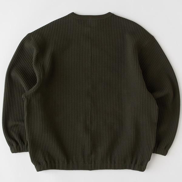 中綿入りのカット素材を使用することで、独特な暖かみのある仕上がりになったクルーネックスウェット。肉厚な生地感と独特なBIGシルエットにより、一枚ではもちろんのこと、上からアウターを羽織っていつもとは違うレイヤードスタイルを楽しみたい。胸の刺繍と裾のブランドネームが程よいアクセントに。