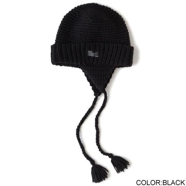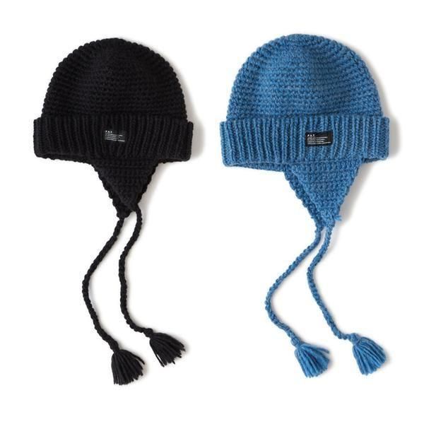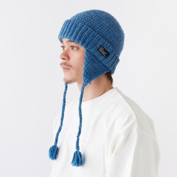 暖かみのある太番手糸をハンドメイドで編み上げたニットキャップ。コーディネートにアクセントを与えてくれるイヤーフラップは、防寒性を兼ね備えたデザイン。サイドのブランドネームがさり気なく主張してくれる。