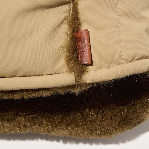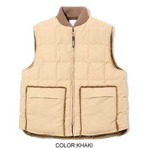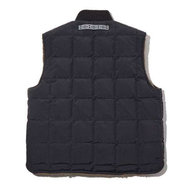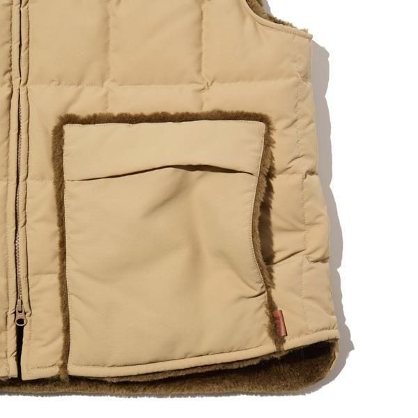 ナイロンのボアダウンベスト。リバーシブル裏面は保湿性のあるボアフリース。フロントファスナーにロゴ入り織りネーム付き引き手、パッチポケットにウォッシャブルレザーピスネーム付き。ナイロンサイド背面の衿釣りにリフレクタープリント入り。襟元にタイベックネーム、内ポケット付き。