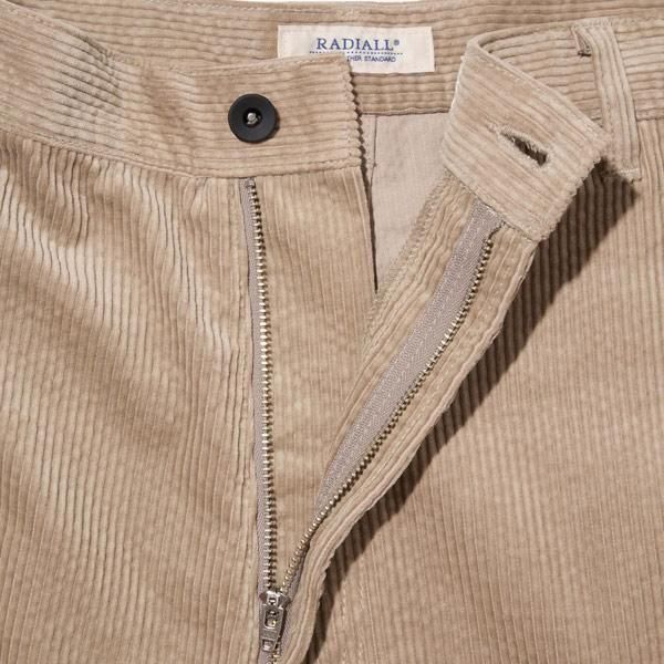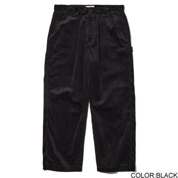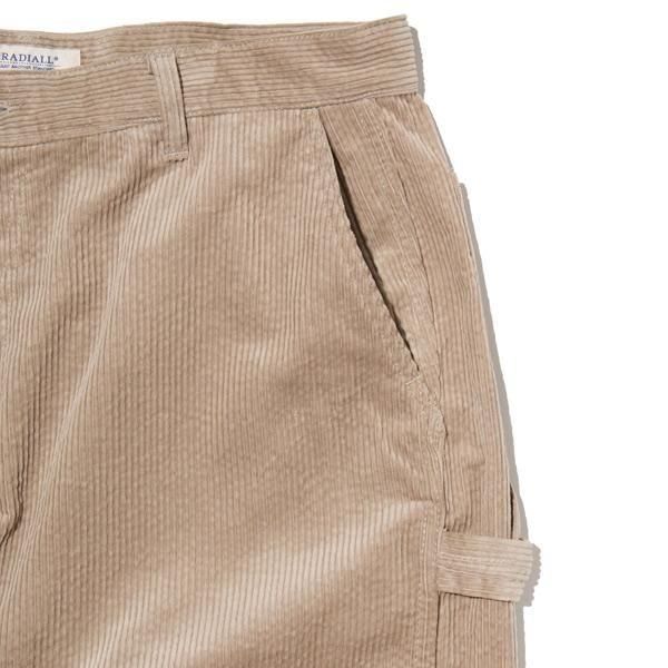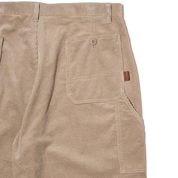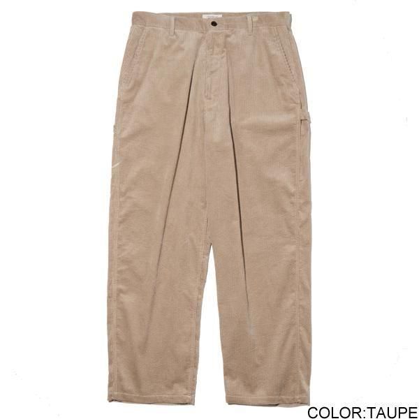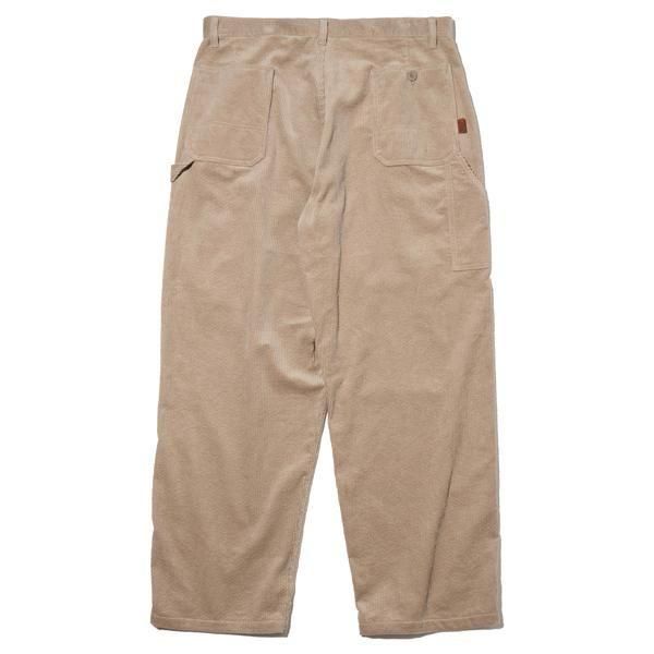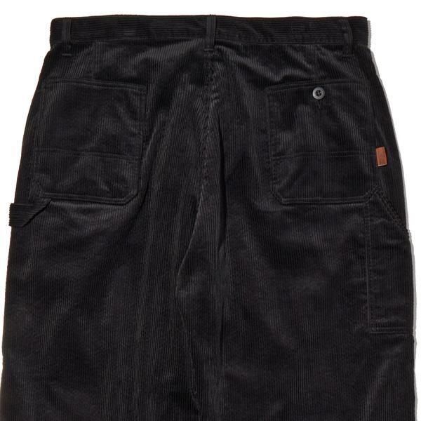 太畝コーデュロイのペインターパンツ。ワイドフィット。ジッパーフライ。左脇にハンマーループ、右脇にツールポケットを装備。右バックポケット脇にウォッシャブルレザーのピスネーム付き。