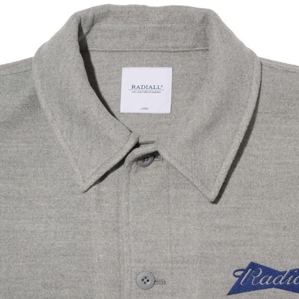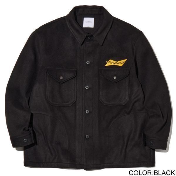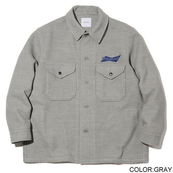 軽くイージーケアなポリエステルメルトンのCPOシャツ。ボックスワイドシルエット。 アウターとしても着用可能なサイジング。ウエストポケット付き。左胸にロゴ刺繍が入る。