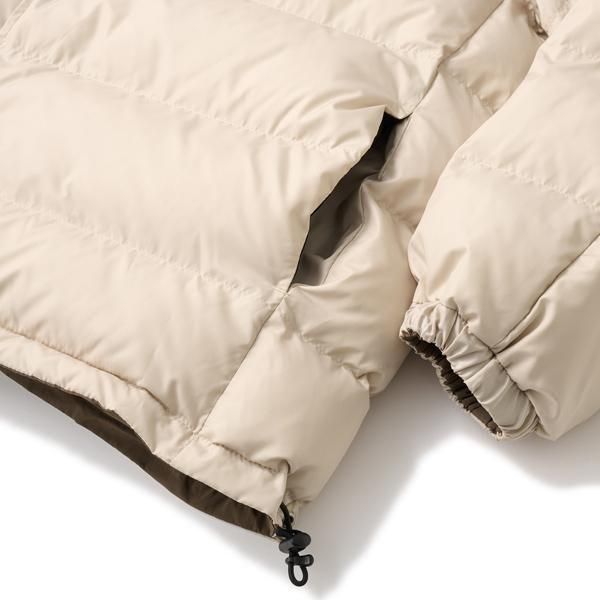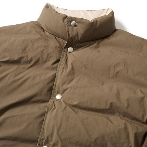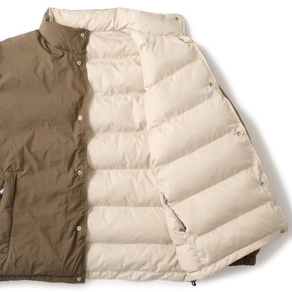 表地には防水加工を施したナイロンタフタを使用。右袖にブランドネーム。リバーシブル面にも防水加工を施したポリエステルリップストップタフタを使用。左胸にブランドネーム。3M社のフェザーレスTHINSULATEの700フィルパワーの中綿入りリバーシブルジャケット。