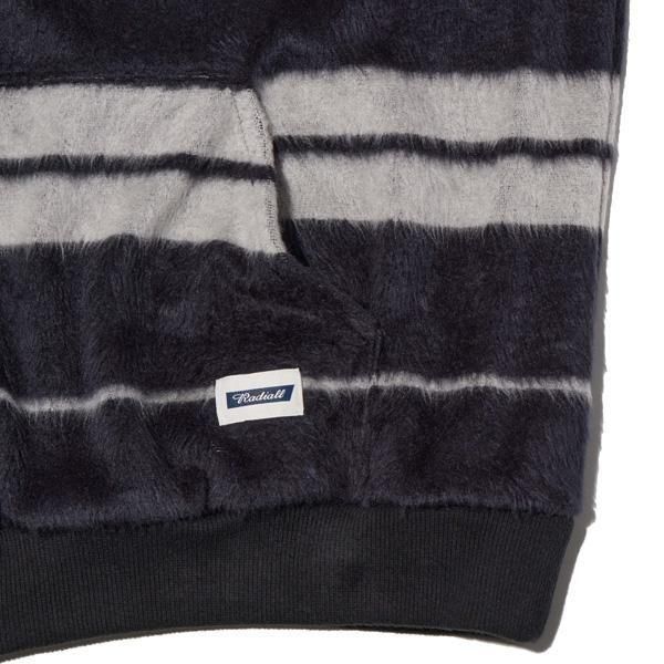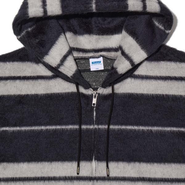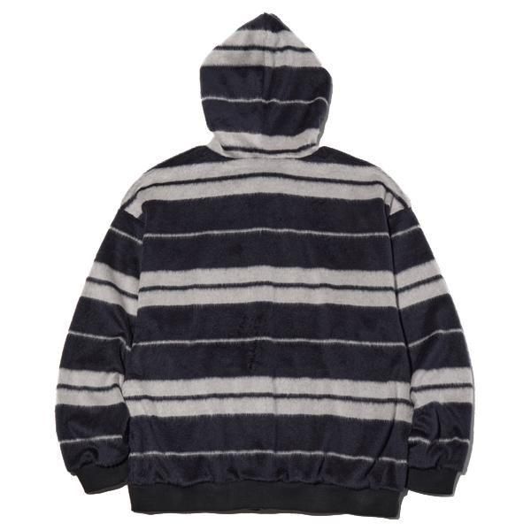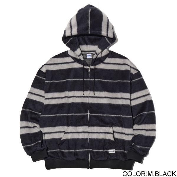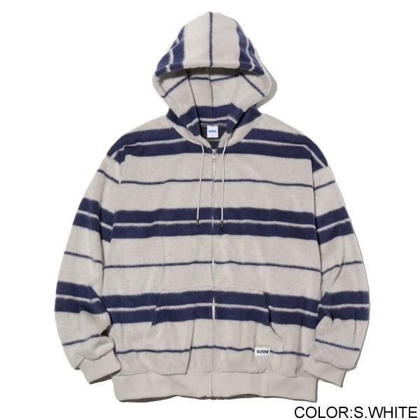 毛足の長いシャギー生地のジップアップフーディー。クルーネックロングスリーブTシャツ。ボックスワイドシルエット。裾口はラウンドカット。伸縮性を持ちながらも型崩れしにくくイージーケア。カンガルーポケット左側にネーム付き。