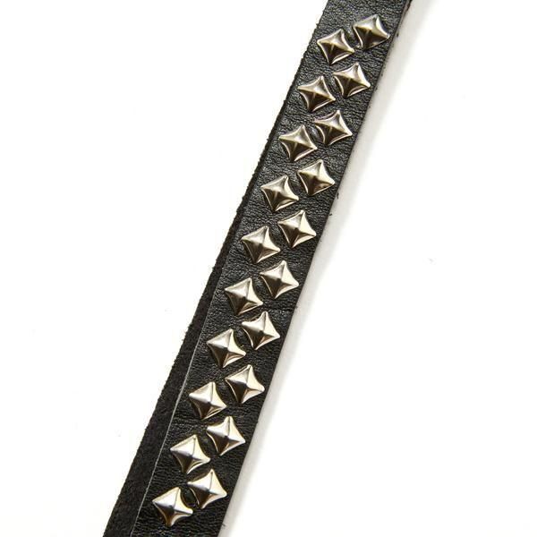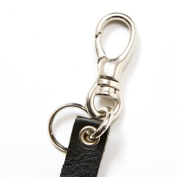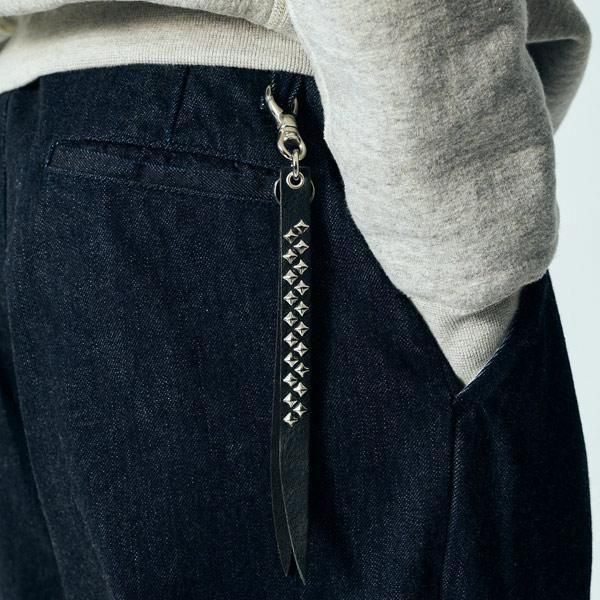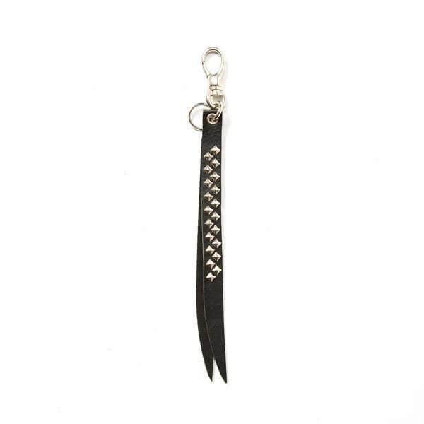 スタッズレザー作製されたショートタイプキーリング。チャームレザーにピラミッドスタッズを配した。裏側にもブランドネームの刻印が入る。